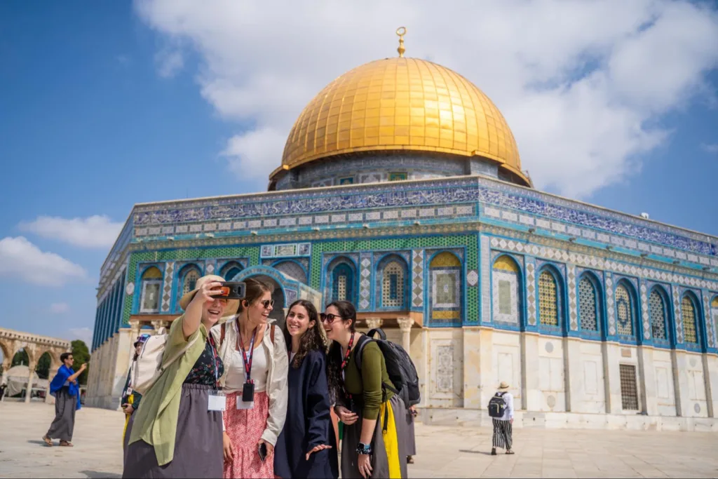 Israeli and American Jewish participants take a selfie in front of the Dome of the Rock in the Old City of Jerusalem.
