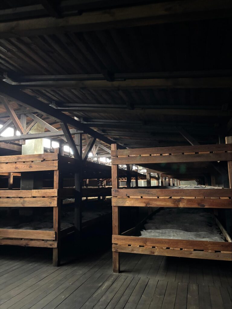 The first camp we visited was Auschwitz-Birkenau. While I studied the history of Nazi concentration and death camps growing up, nothing could have prepared me for seeing it in person. Walking through the camp, I was struck by the personal artifacts left behind — shoes, hair, and piles of belongings that once belonged to individuals whose lives were as complex as our own. That awareness multiplied itself over and over as we moved through the space.
